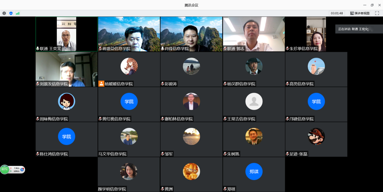 6月24日下午,伟德bv国际体育与中国联通举行线上党组织共建和业务对接活动,中国联通广州市分公司黄埔区分公司总经理王奕文、副总经理苏小柳、广州联通政企客户事业部大数据中心主任汪旭、联通智慧足迹数据科技有限公司大区总监朱树凯、联通智慧足迹数据科技有限公司售前总监张磊、联通大数据公司工程师黄洲等参加交流。伟德bv国际体育党委书记朱珍葶,院长蒋盛益,党委副书记肖锋,副院长谢柏林、王常吉,各系部主任和学生团队指导老师共同参与了线上会议并讨论技术合作相关事宜,会议由肖锋主持。
