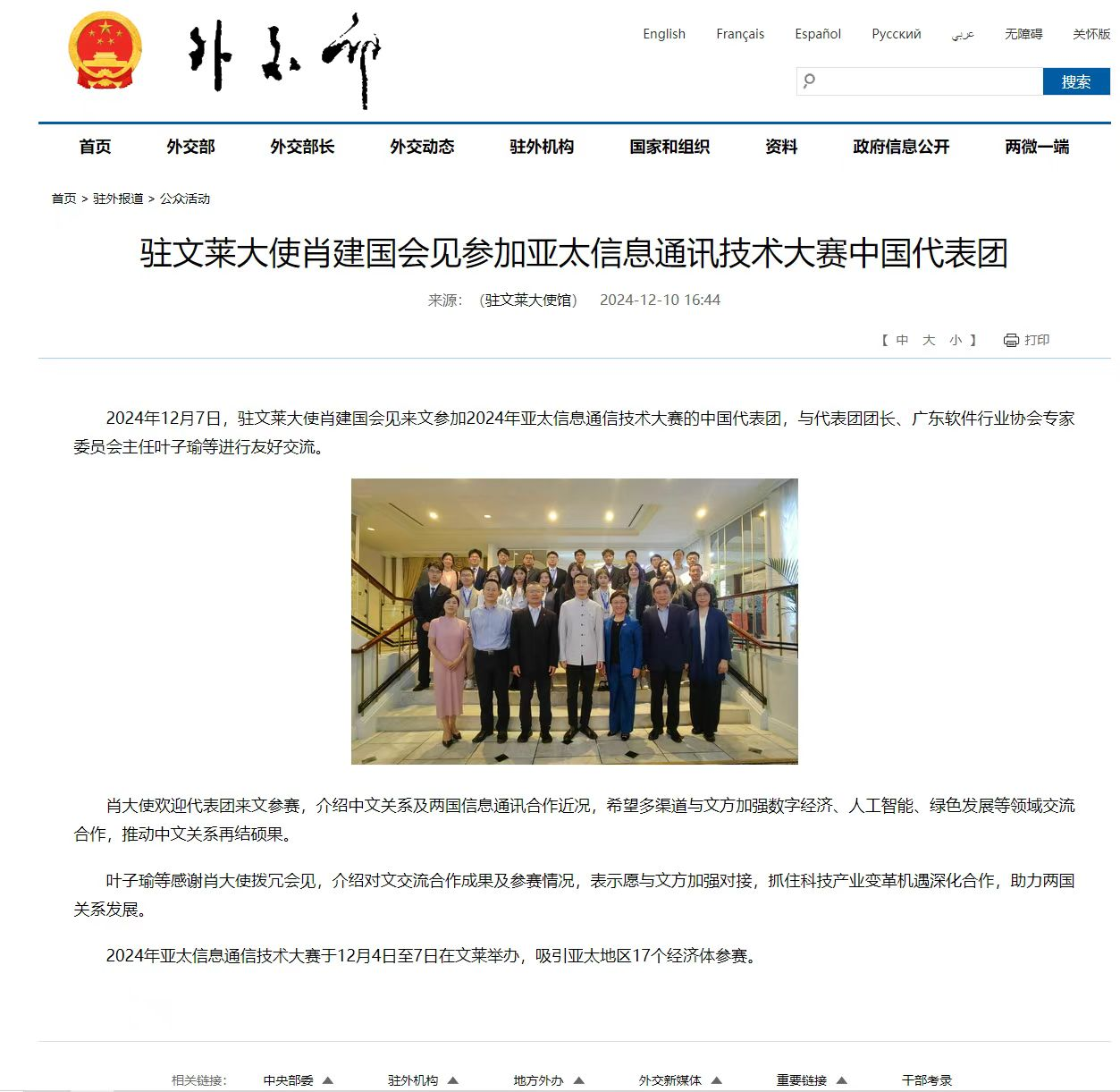 2024年亚太信息通讯科技大赛(APICTA)于12月2日至8日在文莱举办,伟德bv国际体育学子与商学院学子组成的“QuizGenius”项目团队表现出色,在专上学生项目(方案组)中荣获季军。此外,伟德bv国际体育丘心颖教授受邀担任本届大赛的评委。中国驻文莱大使肖建国专程会见了中国代表团,伟德bv国际体育丘心颖教授和参赛学生梁金如、林耀东等参加了会见,外交部网站对此进行了报道。
