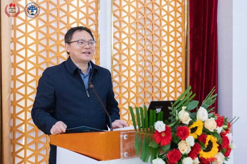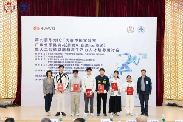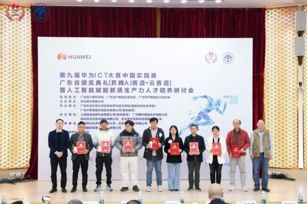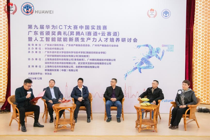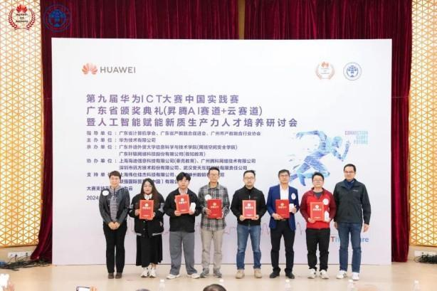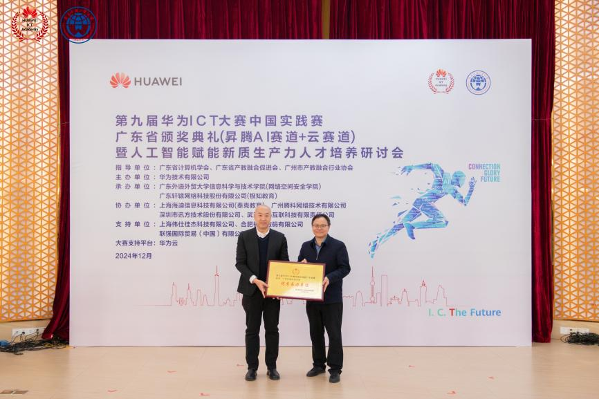 本网讯 2024年12月29日,第九届华为ICT大赛中国实践赛广东省颁奖典礼(昇腾AI赛道+云赛道)暨人工智能赋能新质生产力人才培养研讨会在大学城校区八角楼报告厅成功举办。本次活动由华为技术有限公司主办、广东省计算机学会、广东省产教融合促进会、广州市产教融合行业协会指导,广东外语外贸大学信息科学与技术学院(网络空间安全学院)、广东轩辕网络科技股份有限公司(极知教育)承办,汇聚了来自高校、企业及行业组织的众多专家学者,共同探讨了人工智能在新质生产力人才培养中的重要作用。我校副校长刘建达,伟德bv国际体育党委书记柯晓华、院长王常吉、副院长谢柏林、党委副书记刘丽玉出席本次颁奖典礼和研讨会。