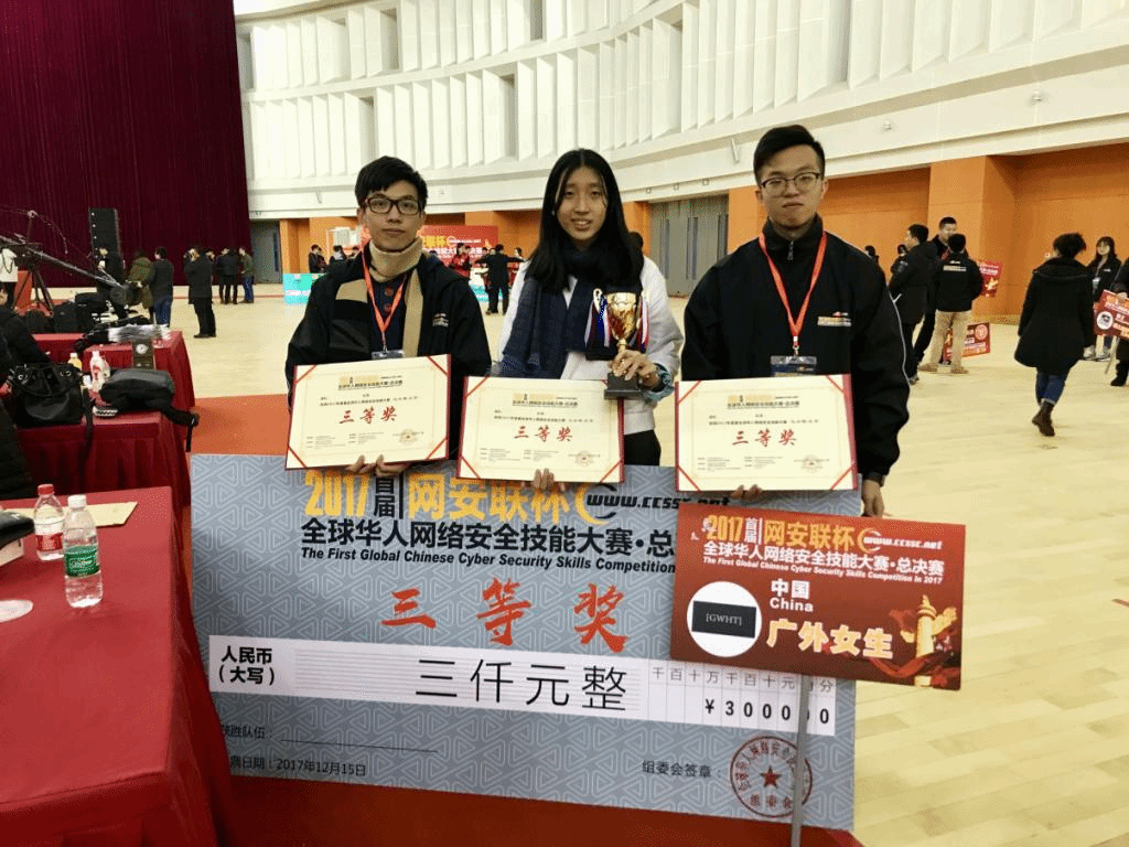 2017年12月15日,2017首届全球华人网络安全技能大赛的总决赛于中国传媒大学隆重举行,伟德bv国际体育“广外女生”战队在总决赛中取得第五名,荣获三等奖。“广外女生”战队由来自网络安全实验室的三名2015级本科生组成,成员分别为:曾泽君、叶豪、刘浩仪。