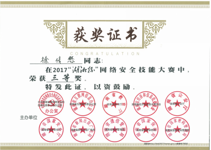 另外,2017年12月7日伟德bv国际体育“广外幽灵”战队在“湖湘杯”2017年网络安全技能大赛的决赛中取得第四名,荣获三等奖,“湖湘杯”2017年网络安全技能大赛是由湖南省委网信办举办,面向全国的大型网络安全比赛,参赛选手包括网络安全企业工作人员、高校博士生等。“广外幽灵”战队由来自网络安全实验室的三名2015级本科生组成,成员分别为:徐传懋、何韬、黎志江。