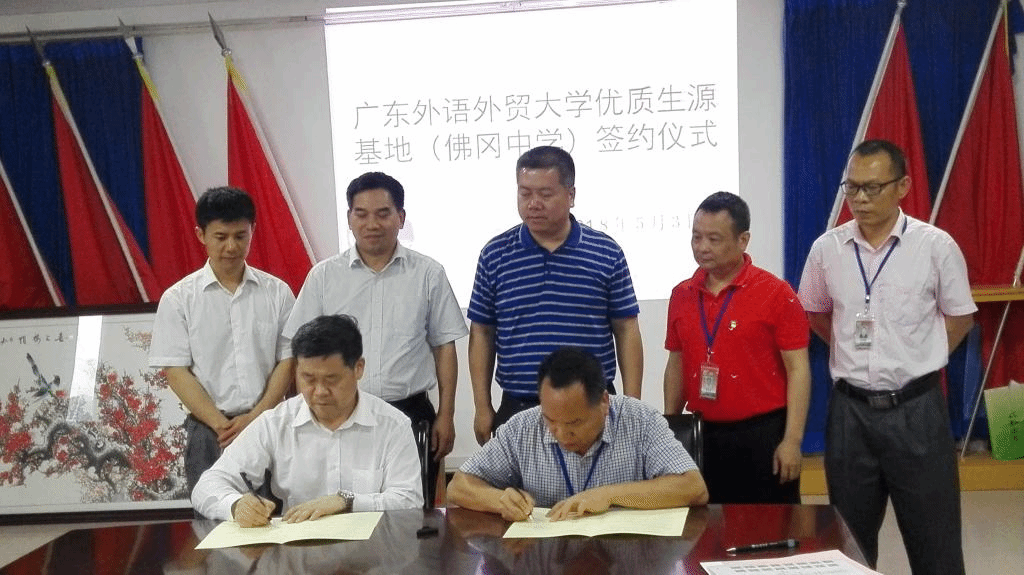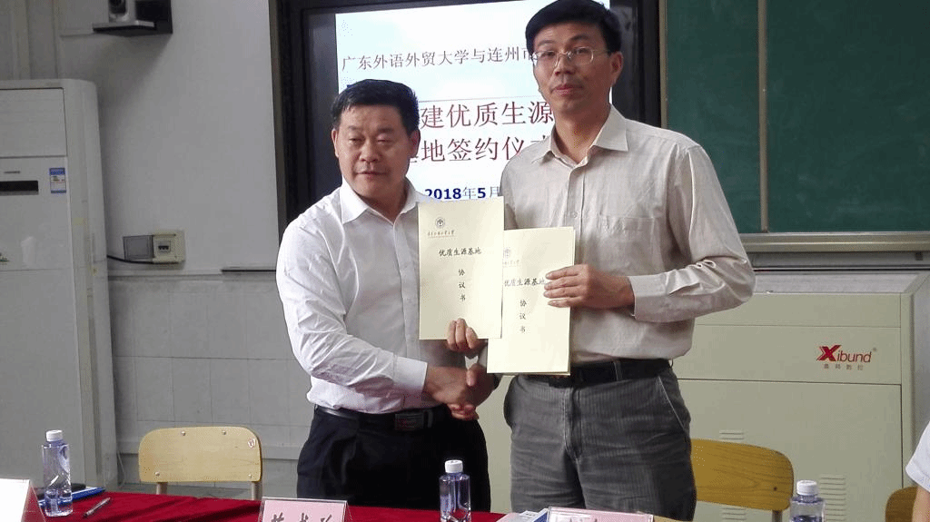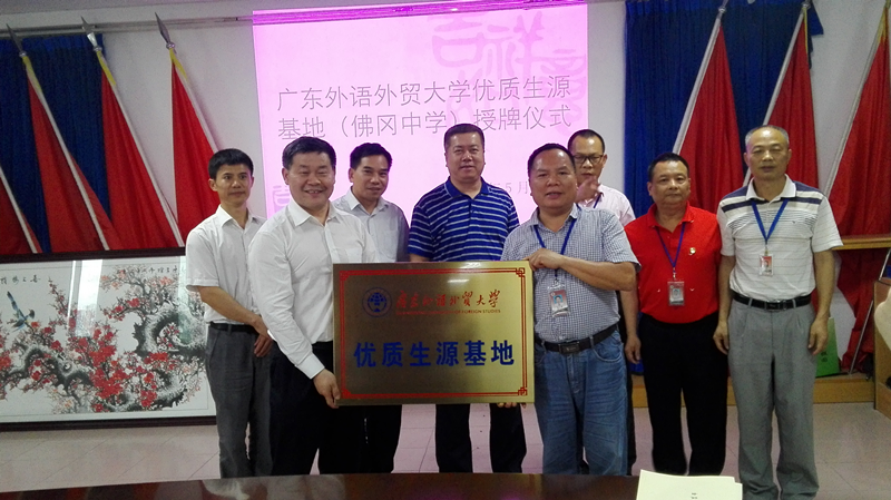 蒋盛益代表学校向3所学生授予“广东外语外贸大学优质生源基地”牌匾并合影留念。招生宣传得到了连州市、佛冈县政协、教育局及3所学校的大力支持。