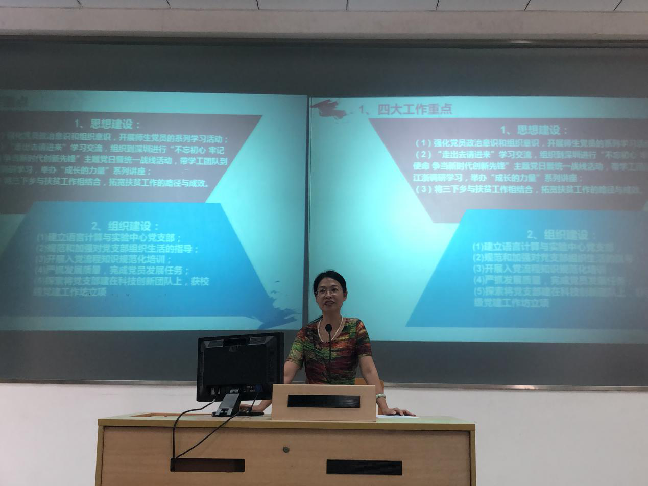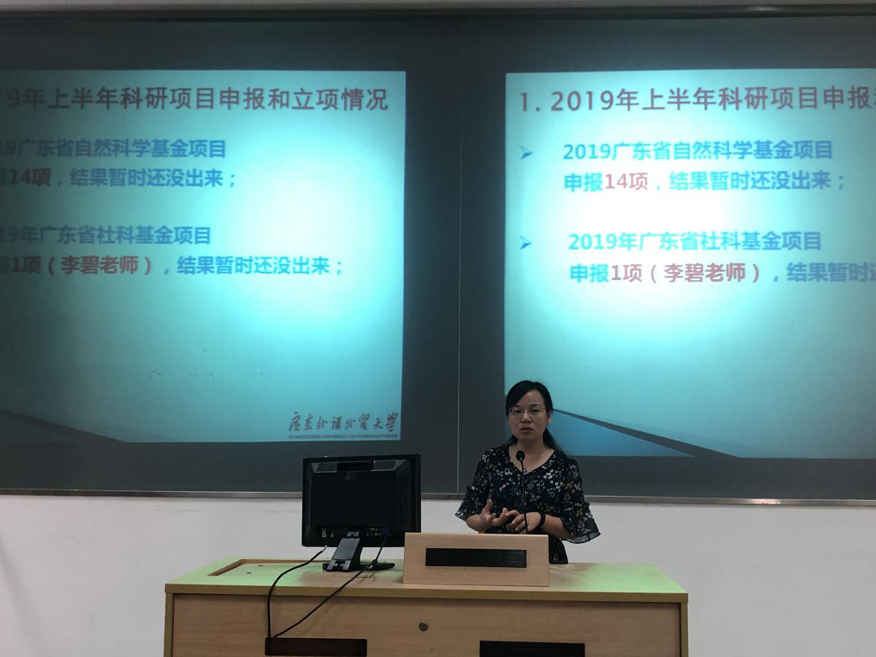 副院长李霞结合实际对科研及研究生工作发表讲话,针对2019年上半年学院科研申报和立项情况、下半年可申报项目情况、2019年上半年学院研究生招生工作情况进行汇报。她鼓励教师积极申报项目,希望教师在新的学期的工作中再接再厉。
