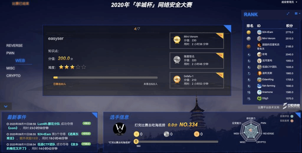 2020年9月10-11日,伟德bv国际体育成功承办2020年“羊城杯”网络安全大赛。本次大赛由广州市委网信办主办,广东外语外贸大学承办,作为广州市网络安全宣传周亮点活动之一,大赛吸引了全国高校、广州市政企事业252家单位,约550支队伍,接近1600名选手报名参赛。