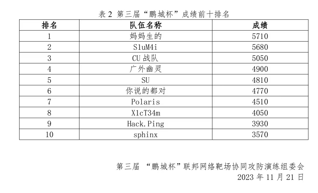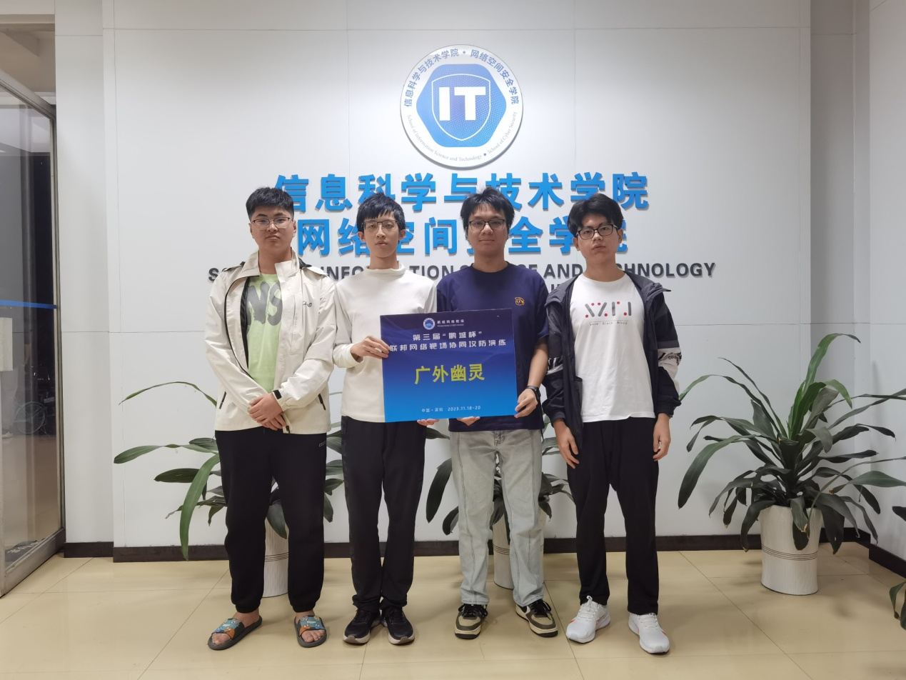本网讯 11月20日,由鹏城实验室举办的第三届“鹏城杯”联邦网络靶场协同攻防演练决赛圆满收官,来自学院网安实验室四名本科生傅学瑜、潘智、李子彦、宋皓等四名同学组成的广外幽灵战队荣获第四名(三等奖)。