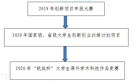 6.【参赛建议】同学们请先积极申报学院2019年创新项目申报大赛、待作品打磨成熟,参加2020年国家级、省级大学生创新创业训练计划项目,之后再参加2020年“挑战杯”大学生课外学术科技作品竞赛。比赛步骤如图所示:
