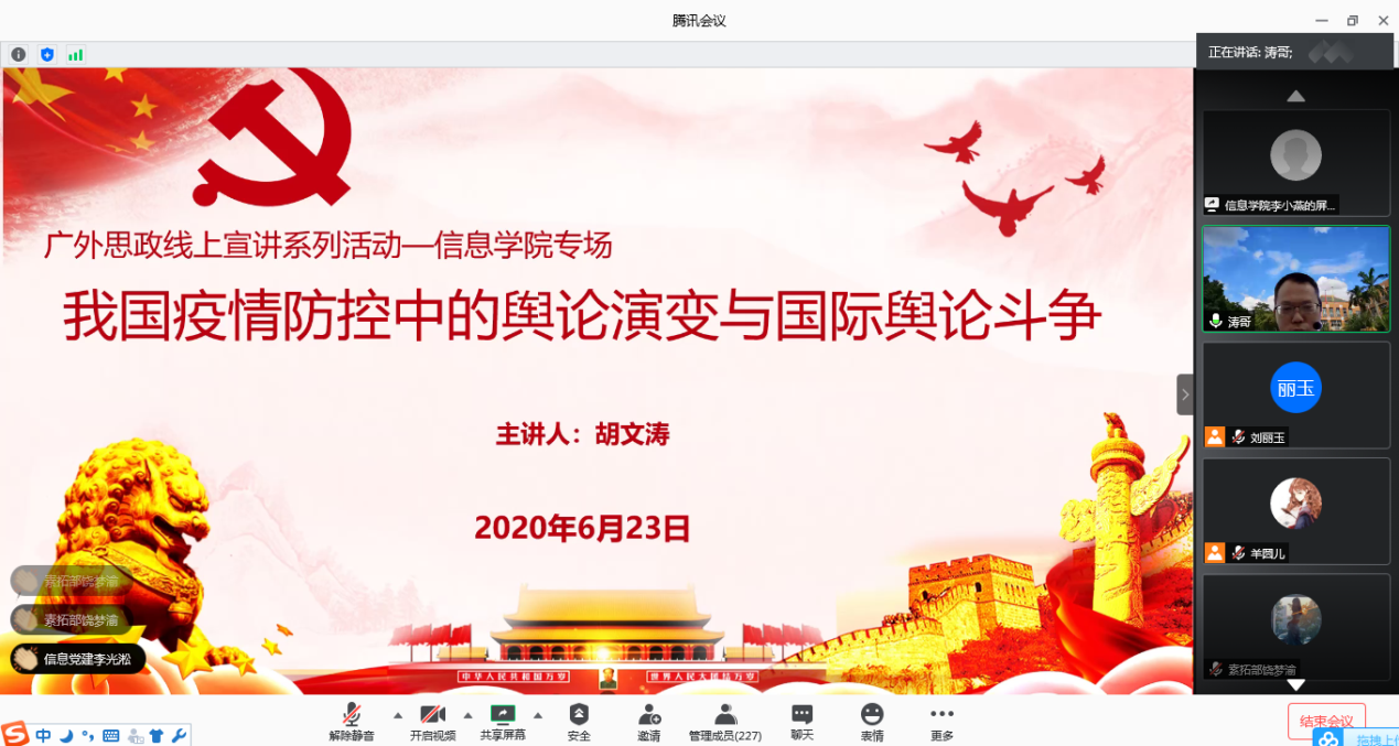 本网讯 2020年6月23日晚,伟德bv国际体育党委举办线上思政宣讲会,校党委常委、党委宣传部部长、党委教师工作部部长胡文涛作题为“我国疫情防控中的舆情演变与国际舆论斗争”主题宣讲,伟德bv国际体育党政领导班子、党支部书记、系部办主任、全体教工和学生党员参加宣讲会。宣讲会由伟德bv国际体育党委书记朱珍葶主持。
