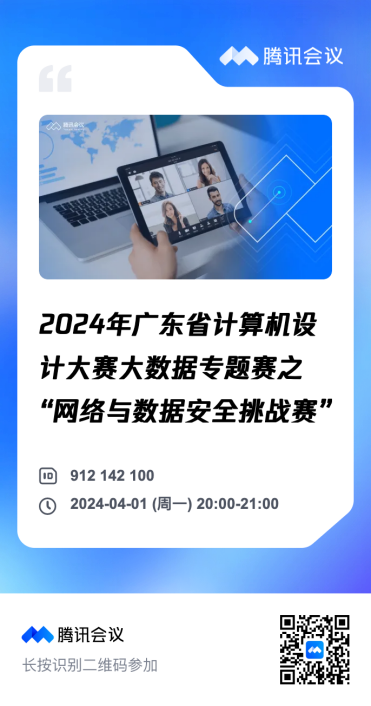 赛项说明会将会在20244120:00准时于腾讯会议(912-142-100)召开,请各位参赛选手扫码预约观看。