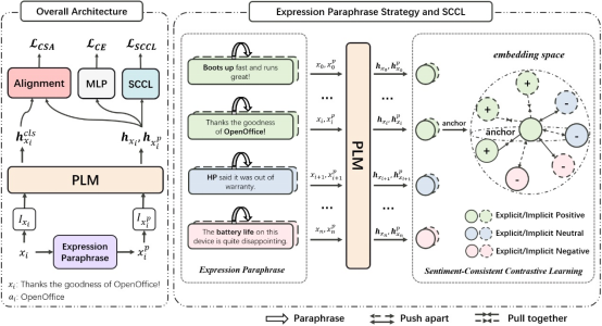 隐式情感学习(Implicit Sentiment Learning)是方面级情感分析(ABSA)中的一个具有挑战性的研究重点;由于隐式情感表达缺乏直接形容某个方面的观点词或明显的情感描述,隐式情感学习旨在提升模型感知由隐式情感表达的情感信息的能力,进而提升模型预测目标方面的情感极性的准确性。现有的隐性情感学习方法主要侧重于独立地捕捉隐式情感知识,而没有更多地关注隐式情感和显式情感之间的潜在联系。从语言学的角度来看,隐式和显式情感表达在表达同一个方面的相同情感极性时,本质上是相似的。本文提出了一种情感表达转述策略和情感一致性对比学习机制,促使模型学习隐式情感和显式情感表达之间的内在联系,进而增强模型感知和捕捉隐式情感的能力。我们在开源数据集上开展了广泛的实验,研究结果显示我们的方法在隐式情感分析以及提升模型健壮性等属性上表现出了有效性。