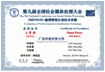 “SMP2020微博情绪分类技术评测”的获奖证书