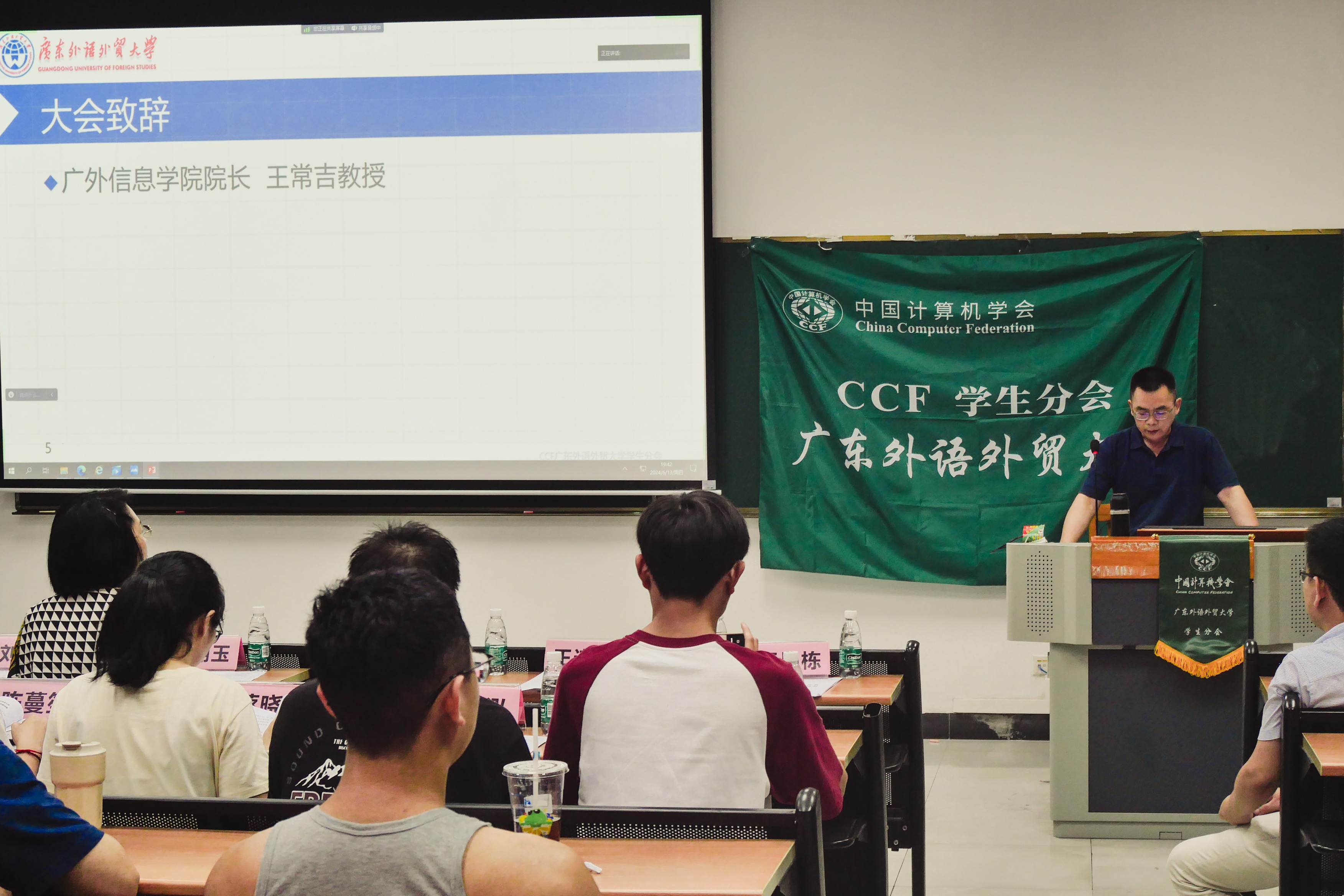 王常吉院长首先作大会致辞,他强调,CCF广东外语外贸大学学生分会为青年才俊提供更多的展示平台与发展机会。王院长进一步阐释加入CCF会员所带来的丰富权益,这不仅是对个人专业成长的极大助力,也是对未来职业生涯的宝贵投资,他热情邀请更多学子加入CCF,共同探索计算机科学的无限可能。