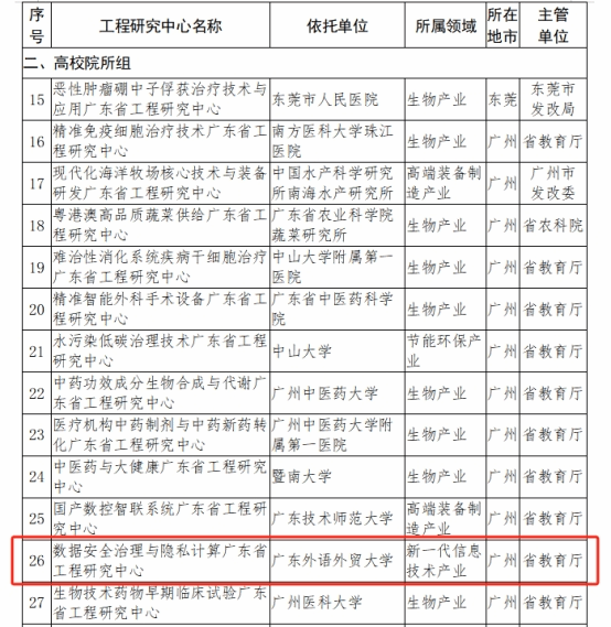 近日,伟德bv国际体育申报的“数据安全治理与隐私计算广东省工程研究中心”经广东省教育厅推荐报送,正式获得广东省发展和改革委员会组建批复。本工程研究中心的成功申报不仅是对伟德bv国际体育科研实力与创新能力的有力证明,更是继2017年成功获批“广东省网络空间内容安全工程技术研究中心”之后,获得的又一个彰显学院科研底蕴与创新活力的省级学科平台。