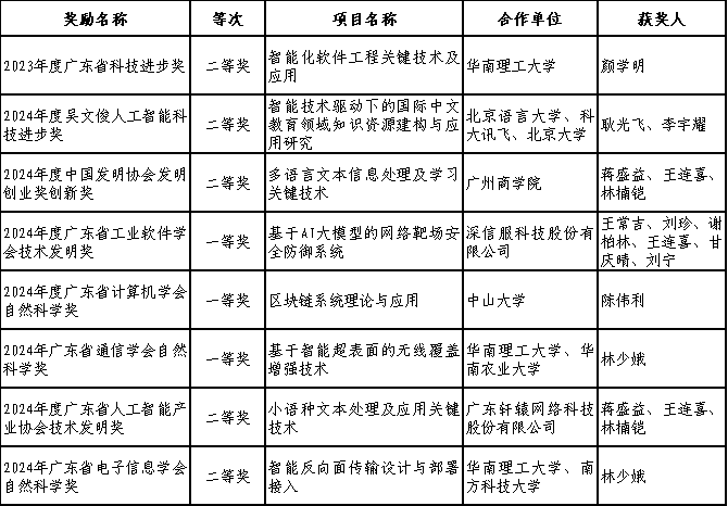 2024年度,伟德bv国际体育在各类科学技术奖评选中表现突出,共斩获8项政府级及学会级科学技术奖项,涵盖人工智能、网络安全、工业软件、多语言信息处理、通信技术等多个前沿领域,充分彰显了学院在交叉学科研究方面的创新实力与优势。其中,3项成果以广东外语外贸大学为第一申报单位,标志着学院在科研创新方面实现了重大突破。