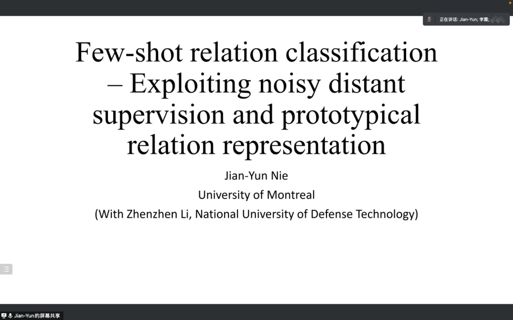少样本关系分类是自然语言处理研究领域中的难题,其目的是解决关系分类中样本数量有限的情况下,如何保证模型正确预测实体间关系的性能。在讲座中,聂建云教授介绍了他与团队的最新研究成果:如何从大量远程监控数据中选择高质量数据和关系描述的原型模型来提高少数样本关系分类的准确性。