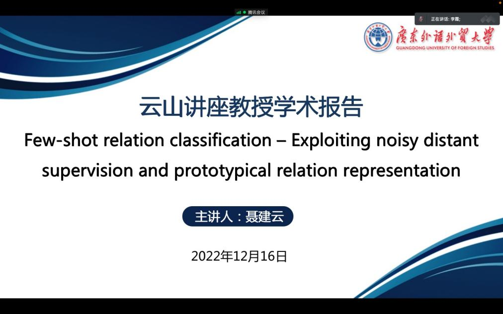 本网讯 2022年12月16日上午,我校云山讲座教授、加拿大蒙特利尔大学聂建云教授应邀在线上为伟德bv国际体育师生作主题为“Few-shot relation classification–Exploiting noisy distant supervision and prototypical relation representation”的学术报告,伟德bv国际体育教师及研究生参加了讲座,讲座由伟德bv国际体育副院长李霞主持。