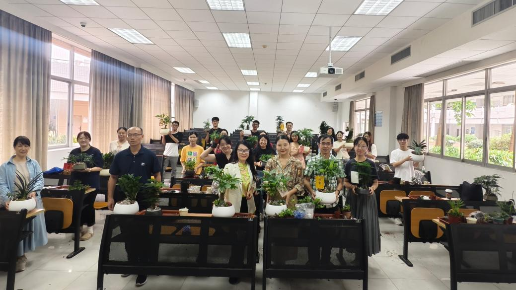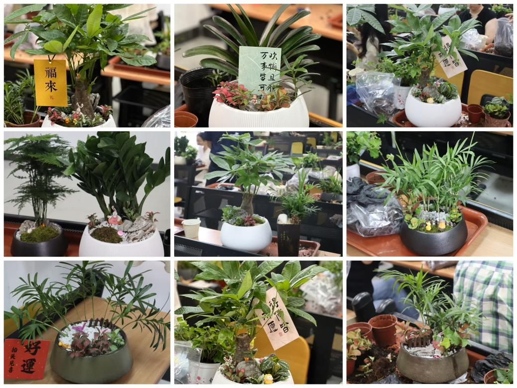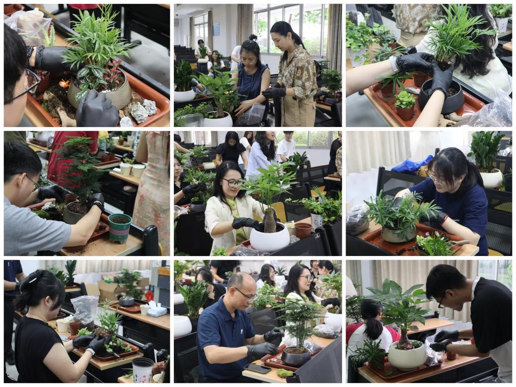 活动接近尾声,老师们捧着各具特色的盆景作品相互展示:或清雅绿植配山石,透着灵动生机;或层植叠竹显意境,藏着中式美学。大家纷纷拍照留念,还围绕盆景后期养护技巧热烈讨论。