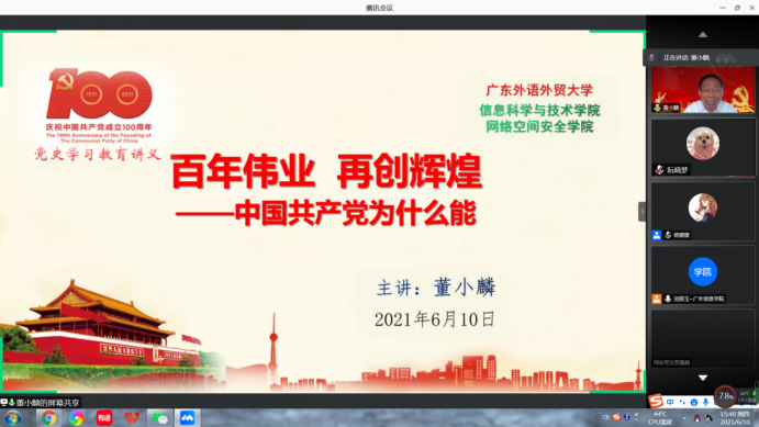 董小麟用丰富的历史事件、鲜活的历史人物、具体的历史数据生动地介绍了中国共产党的百年历史是为中国人民谋幸福、为中华民族谋复兴的百年辉煌历史。他通过解读党史总结了我党百年奋斗历程中“科学的理论指导”、“坚定的理想信念”、“强大的组织优势”、“坚实的群众基础”、“彻底的自我革命”等宝贵经验,并通过专业的经济及国际形势分析传递了对中国共产党必将风雨无阻,坚毅前行,开创新时代伟业的坚定信心。最后,他结合广外伟德bv国际体育的学科特点及发展现状,希望伟德bv国际体育师生以党史学习教育为契机,加强师生政治引领和价值引领,紧抓国家信息化、数字化建设的契机,为国家的科技创新和经济社会高质量发展作出更大贡献。