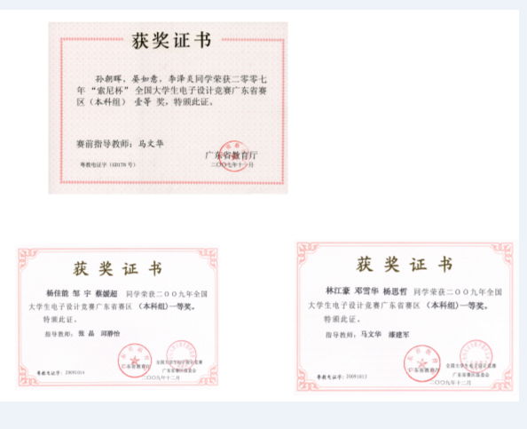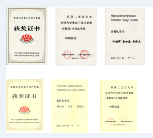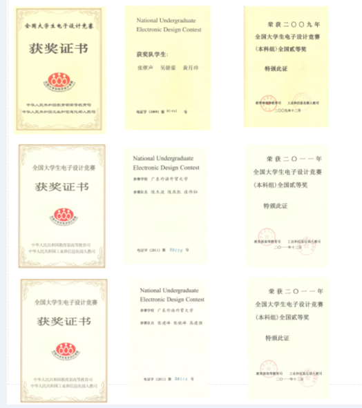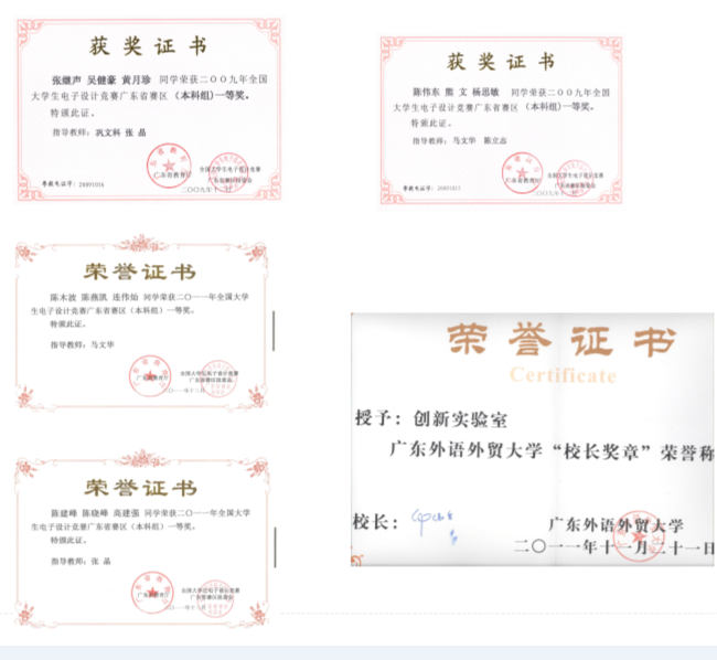 2005年-2015年,实验室共组织参加了6次全国大学生电子设计竞赛,取得5个国家二等奖,10个广东省一等奖,3个挑战杯2等奖,获得广东外语外贸大学首届个人校长奖章和团队校长奖章,获得两个软件著作权专利,一个新型实用专利。产生出了全国小平科技奖获得者林江豪、全国小平科技创新团队英语语音团队。