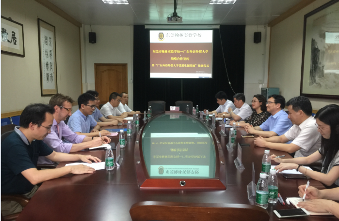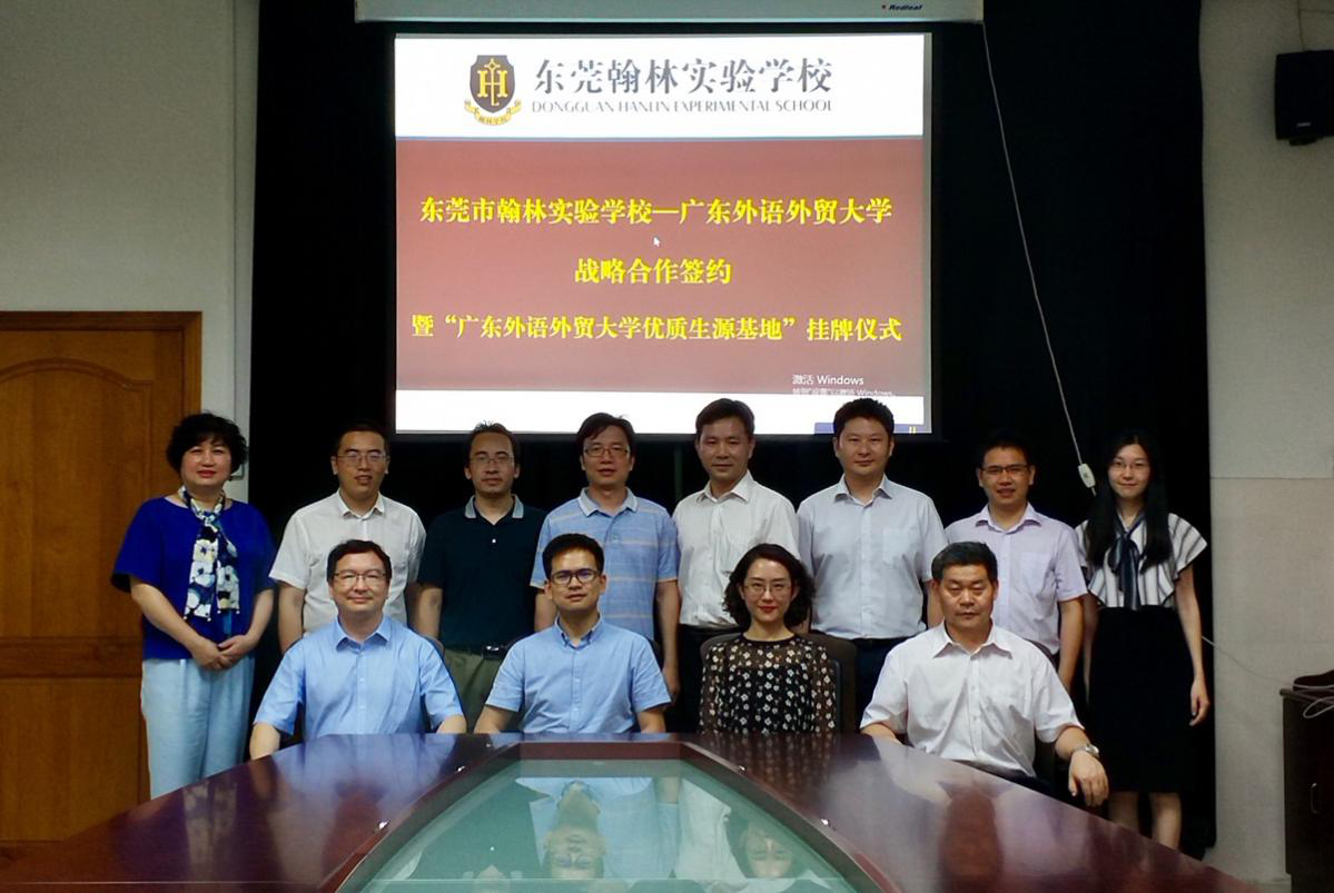 为了加强我校与东莞各中学的沟通与交流,进一步拓展优质生源,2019年5月21日,教务处姜琳处长、伟德bv国际体育蒋盛益院长、肖锋副书记、王连喜副研究员和国际学院梁学宏院长、任跃忠副院长等一行赴东莞市翰林实验学校开展招生宣传工作。期间,两校签订了“优质生源基地”合作协议并举行授牌仪式。东莞市翰林实验学校高中部校长刘汉波、国际部校长叶辰、教务部主任刘志军、高三年级级长黄群乐等热情接待了我方代表。