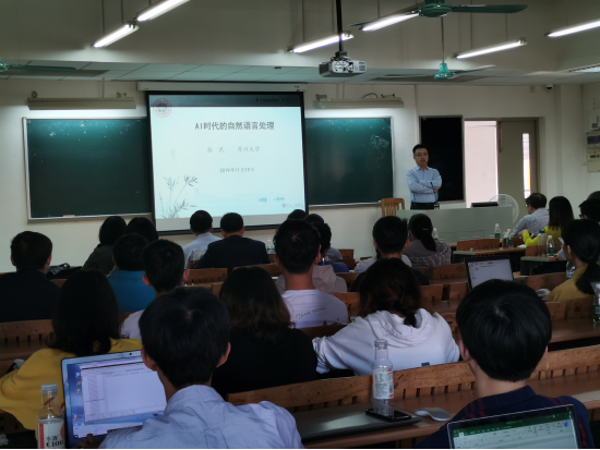 张民教授以AI时代的自然语言处理为主题,就“什么是自然语言处理?其要解决的科学问题、学科内涵、外延、和技术应用场景是什么?在当今人工智能快速发展的大背景下,其研究现状、技术成熟度、新的挑战、应用前景和下一步的发展方向是什么?”等这些问题和关于语言的情感分析在讲座中展开了深入讨论,给在座师生带来更多开拓性视野和内容。张教授还鼓励我校学生,可以更好地结合我校的语言学科优势,积极加入自然语言处理研究队伍。最后,张民教授与在座师生进行了交流,并解答了师生的相关问题。