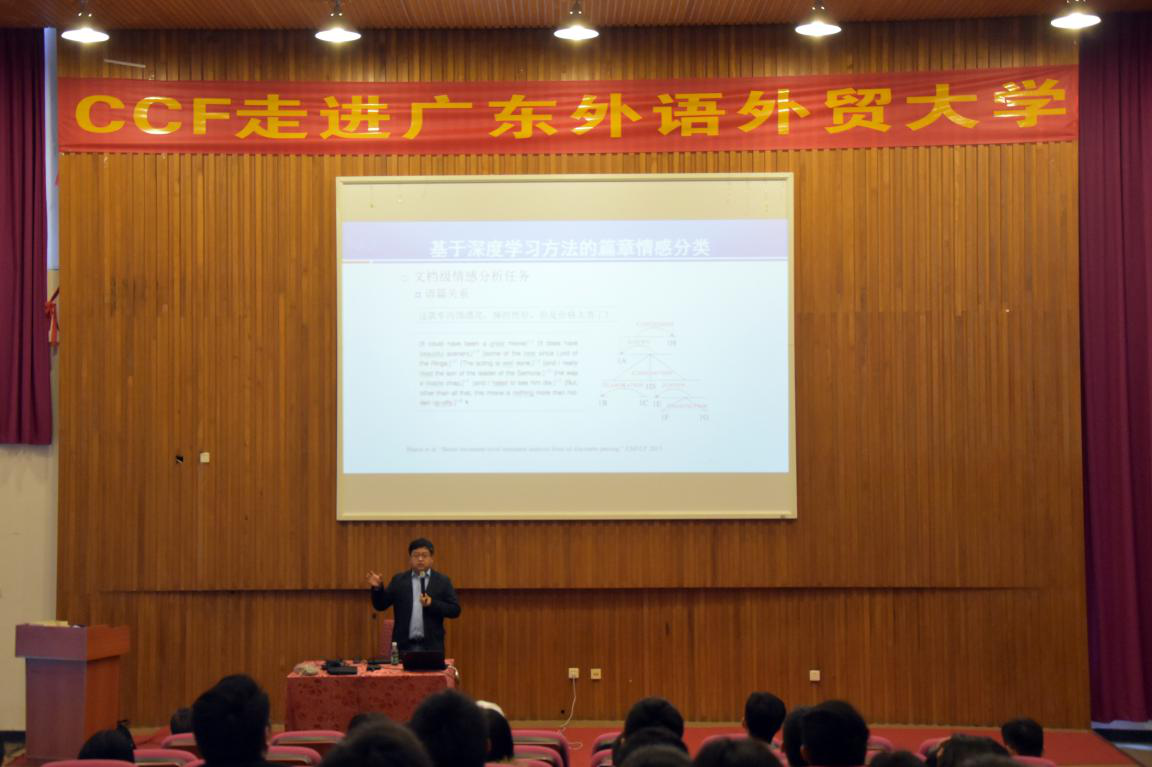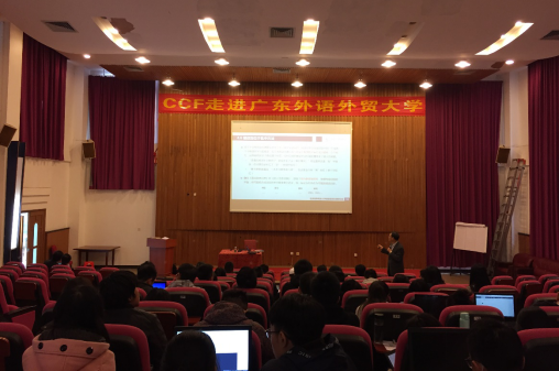 2017年11月24日下午,“CCF走进高校”活动来到广东外语外贸大学。北京信息科技大学的张仰森教授和哈尔滨工业大学的徐睿峰教授分别做了题为“中文文本错误的自动侦测”和“面向社会媒体的文本情感分析”的讲座。讲座由信息科学与技术学院院长蒋盛益教授主持,百余名广外师生以及来自广东当地高校和海南大学等高校的师生共同聆听了此次讲座。