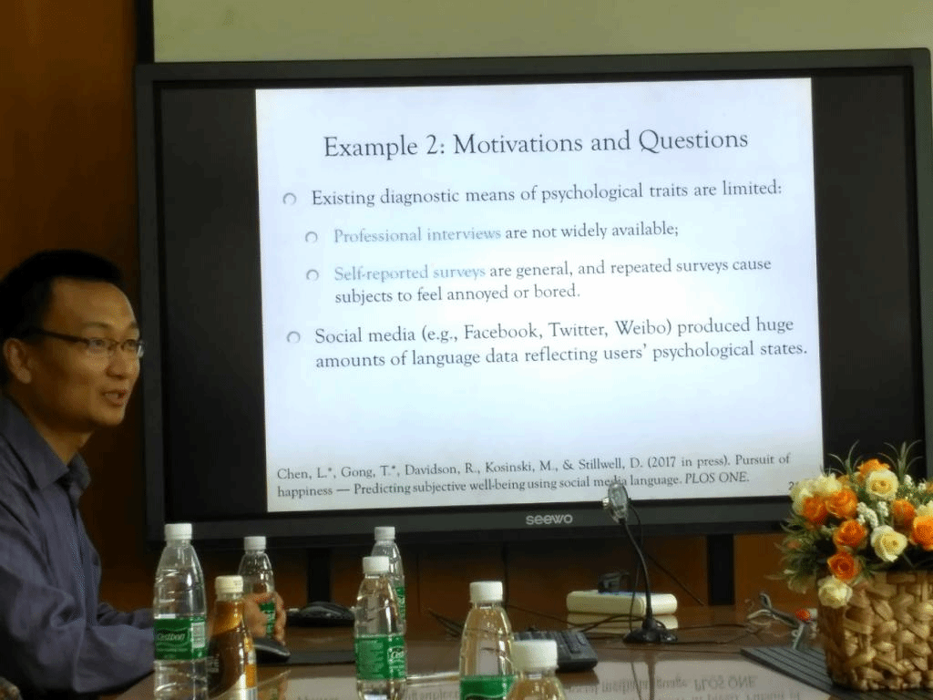 龚涛教授以“数据科学在心理语言学中的应用”为主题,概述了数据科学的特性,并用两个实例介绍如何应用数据科学手段研究心理语言学的问题。第一个例子采用流行的Mixed Effects Modeling研究个体语言与阅读能力的差异对个体眼动模式的调节作用。第二个例子采用Random Forest的机器学习模型探索能否使用Facebook等媒体语言预测媒体使用者的心理学特性如对生活的满意程度等。两个例子系统演示了应用数据科学手段研究传统领域问题的过程,例证了跨学科研究的必要性,对未来相关研究有一定的启示作用。