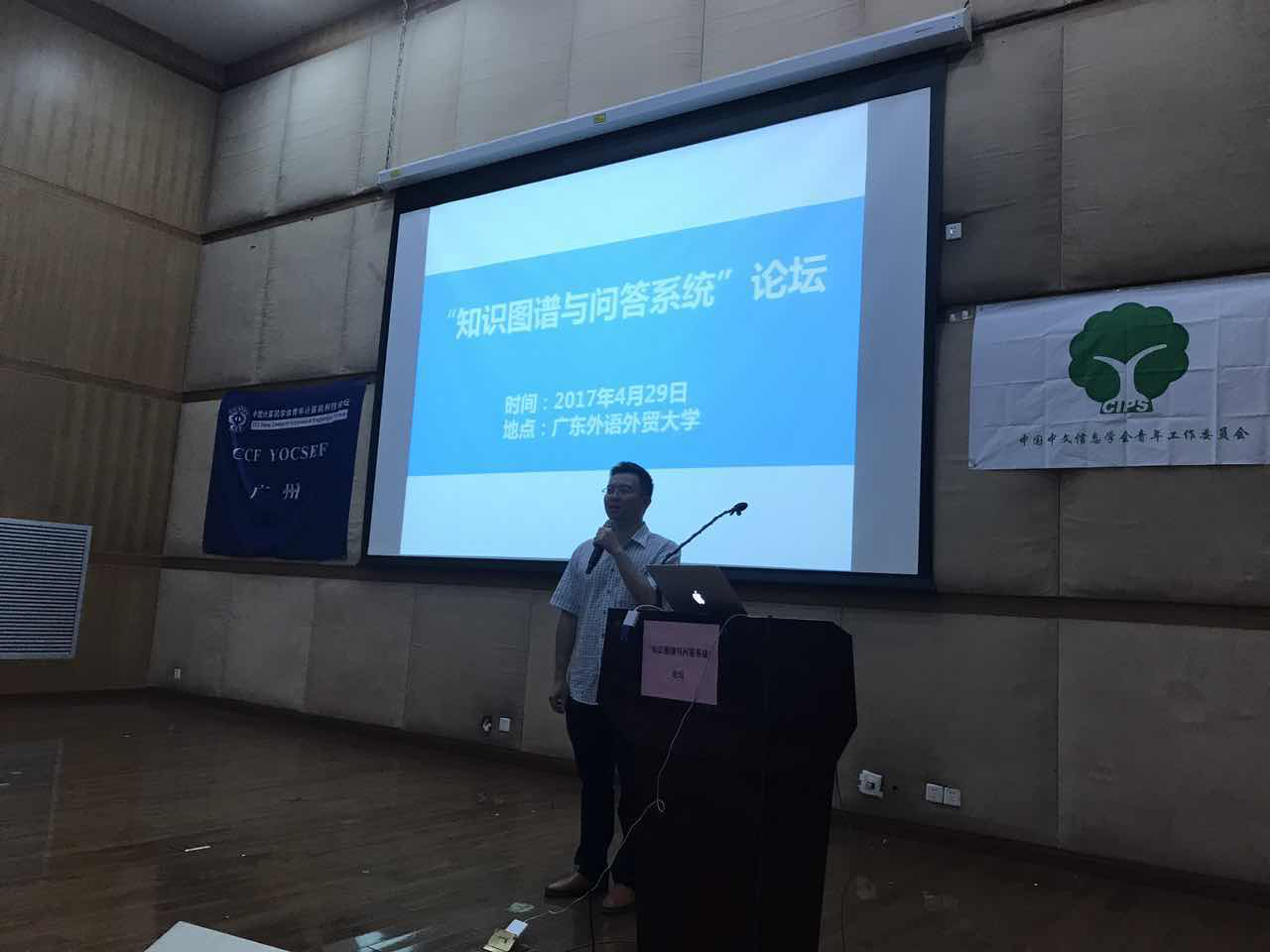2017年4月29日下午,由中国中文信息学会语言与知识计算专委会、中国中文信息学会青年工作委员会和中国计算机学会YOCSEF广州主办,由信息科学与技术学院承办的“知识图谱与问答系统论坛”在广东外语外贸大学南校区图书馆学术报告厅举行。该论坛邀请了知识图谱与问答系统领域的三位业界精英深圳狗尾草智能科技公司CTO王昊奋、广州索答信息科技有限公司CTO徐叶强和微软亚洲研究院副研究员张大卫,以及学术界三位青年才俊中科院自动化所模式识别国家重点实验室副研究员刘康博士、北京大学计算机科学与技术研究所讲师冯岩松博士和哈尔滨工业大学深圳研究生院副教授汤步洲博士进行了专题报告,共同探讨知识图谱和问答系统领域的最新进展和未来趋势,并探索知识图谱与问答系统相结合的新技术突破和产业机会。论坛还邀请了东南大学计算机科学与工程学院教授漆桂林博士进行了知识图谱新发展的介绍和承担Panel问答环节的主持,并邀请了信息科学与技术学院蒋盛益院长致辞。论坛通过会议邦平台报名132人,实际到会超过200人,吸引了省内外众多的专家学者前来参会。