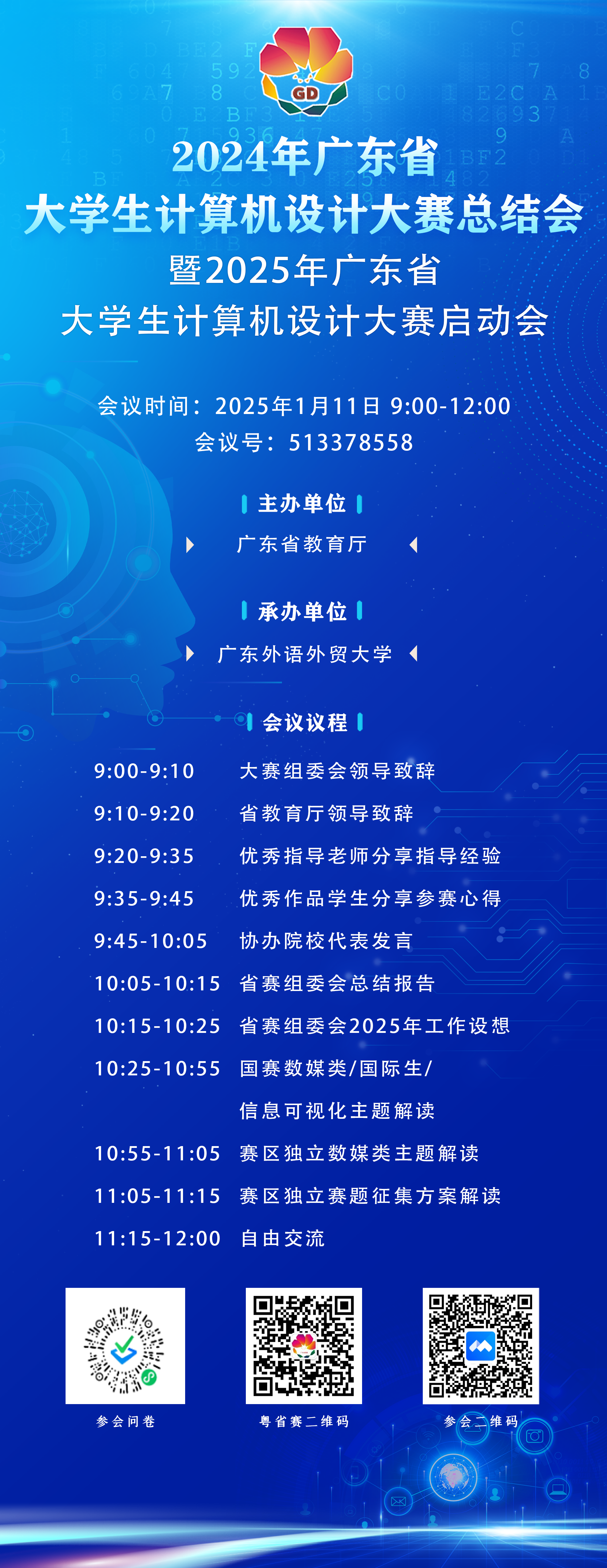 各相关高校,根据《广东省教育厅关于公布2025-2026年广东省本科高校大学生学科竞赛承办单位的通知》的遴选结果,已纳入省学科竞赛统筹范畴的 2025年“广东省大学生计算机设计大赛”将由广东外语外贸大学承办。兹定于2025年1月11日上午9:00-12:00线上举办2024广东省大学生计算机设计大赛总结会暨2025年广东省大学生计算机设计大赛启动会。腾讯会议号:513 378 558。详细信息如下图。欢迎参会交流!