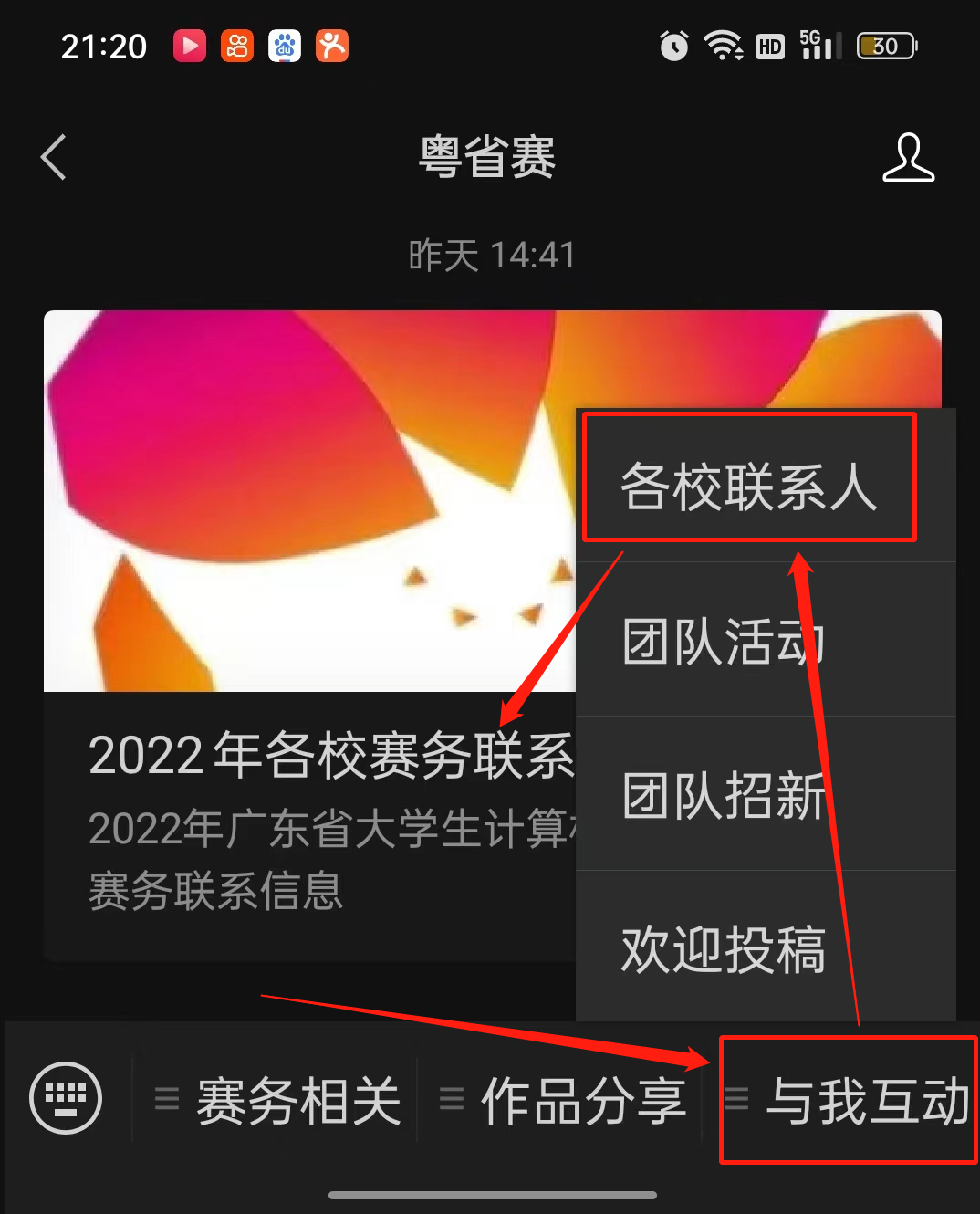 各校赛务联系老师信息,可循以下路径查找:“粤省赛”公众号à“与我互动”菜单à“各校联系人”,如下图所示: