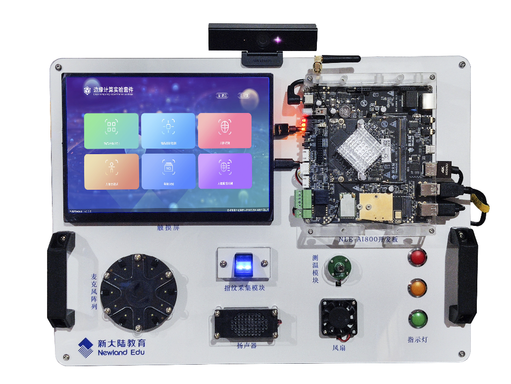 竞赛支持单位提供的竞赛设备为新大陆边缘智能应用实验平台。平台由新大陆自研NLE-AI800嵌入式人工智能核心开发板、图像/语音采集模块、传感器采集模块、执行器等硬件模块组成。开发板基于边缘计算芯片,具有高可扩展性和强大的AI计算能力,支持多传感器输入,集成丰富的硬件接口,内置各类深度学习算法,支持模型部署、模型评估,支持构建算法应用,NLE-AI800开发板的功能强劲表现为算法识别延迟低、可满足端末同时处理多个算法需求、实现人体骨骼检测与可视化显示的性能要求,支撑从竞赛、教学、应用到科研技术方案支撑,满足基于企业级人工智能模型与应用竞赛内容的服务支撑。
